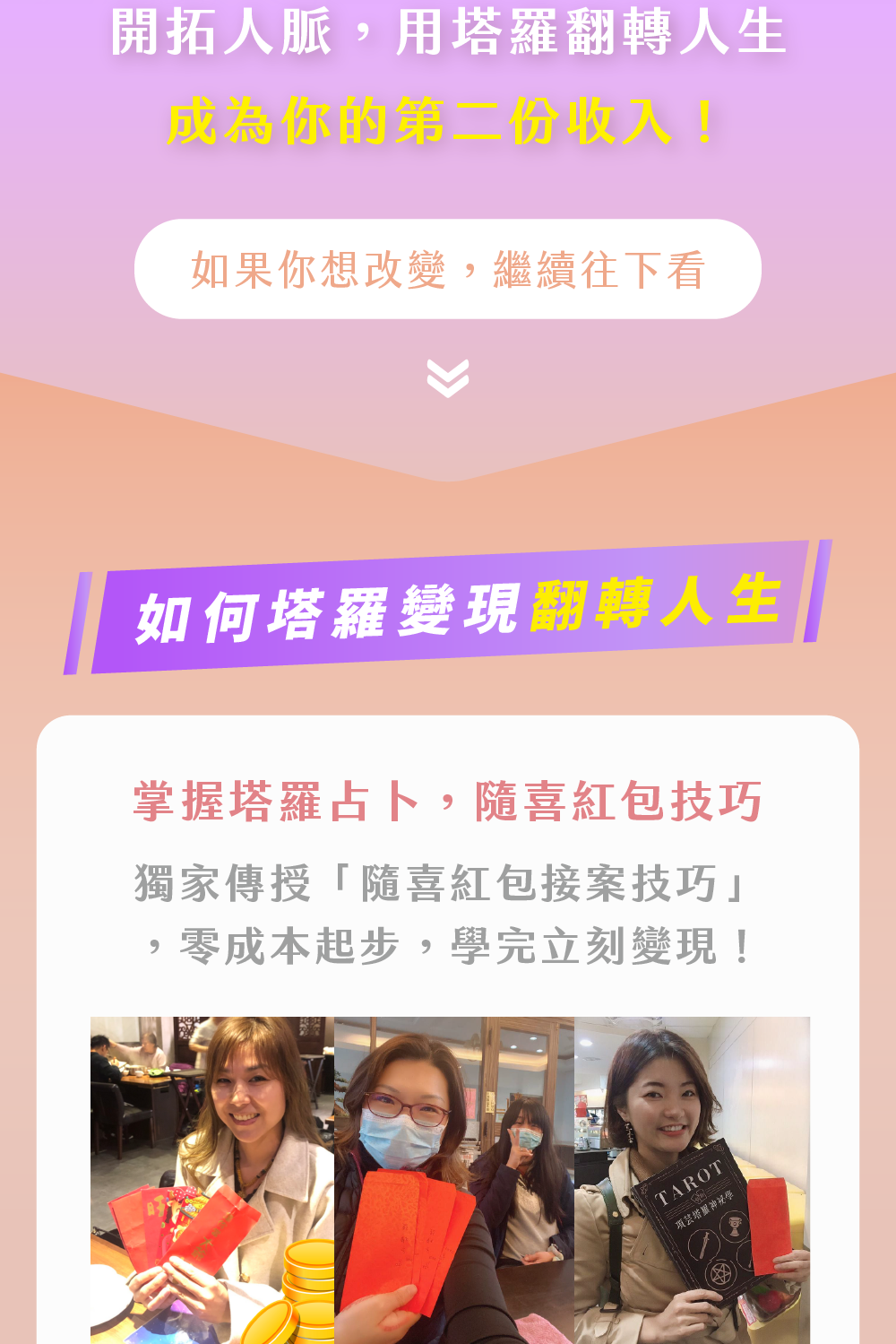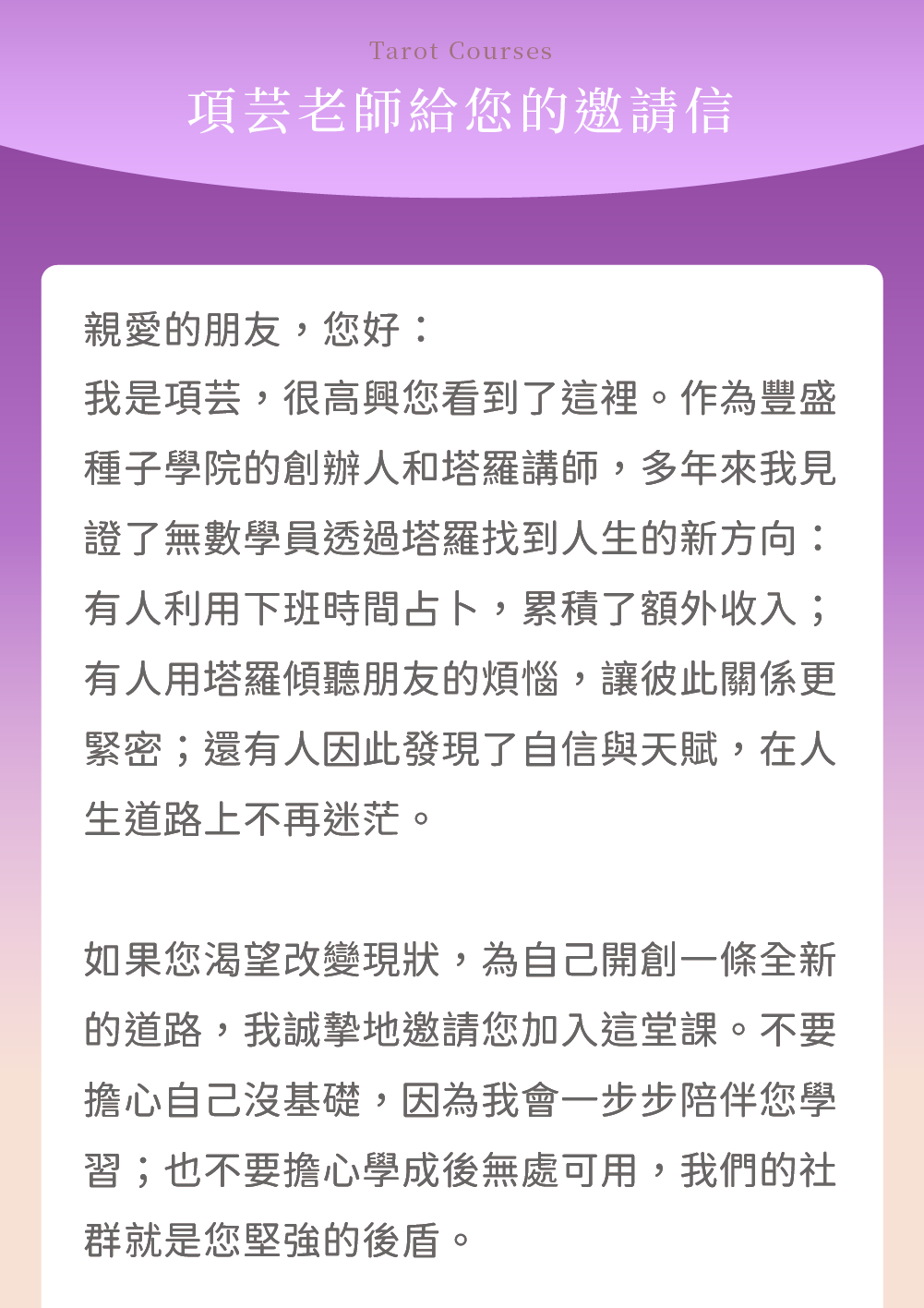 當你步入課程的那一刻,就像打開了一扇通往財富自由的大門。在這裡,我們將一步步打破你對金錢的既有框架,重新定義你與財富的關係。 量身打造的方式來為學員規劃,陪跑2年