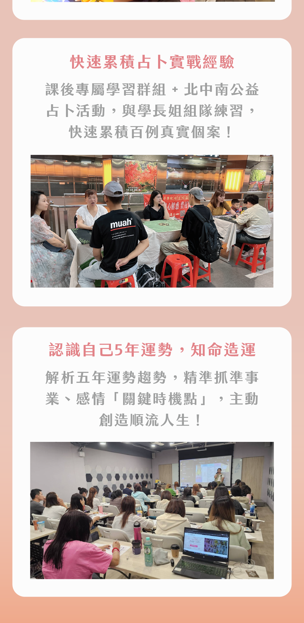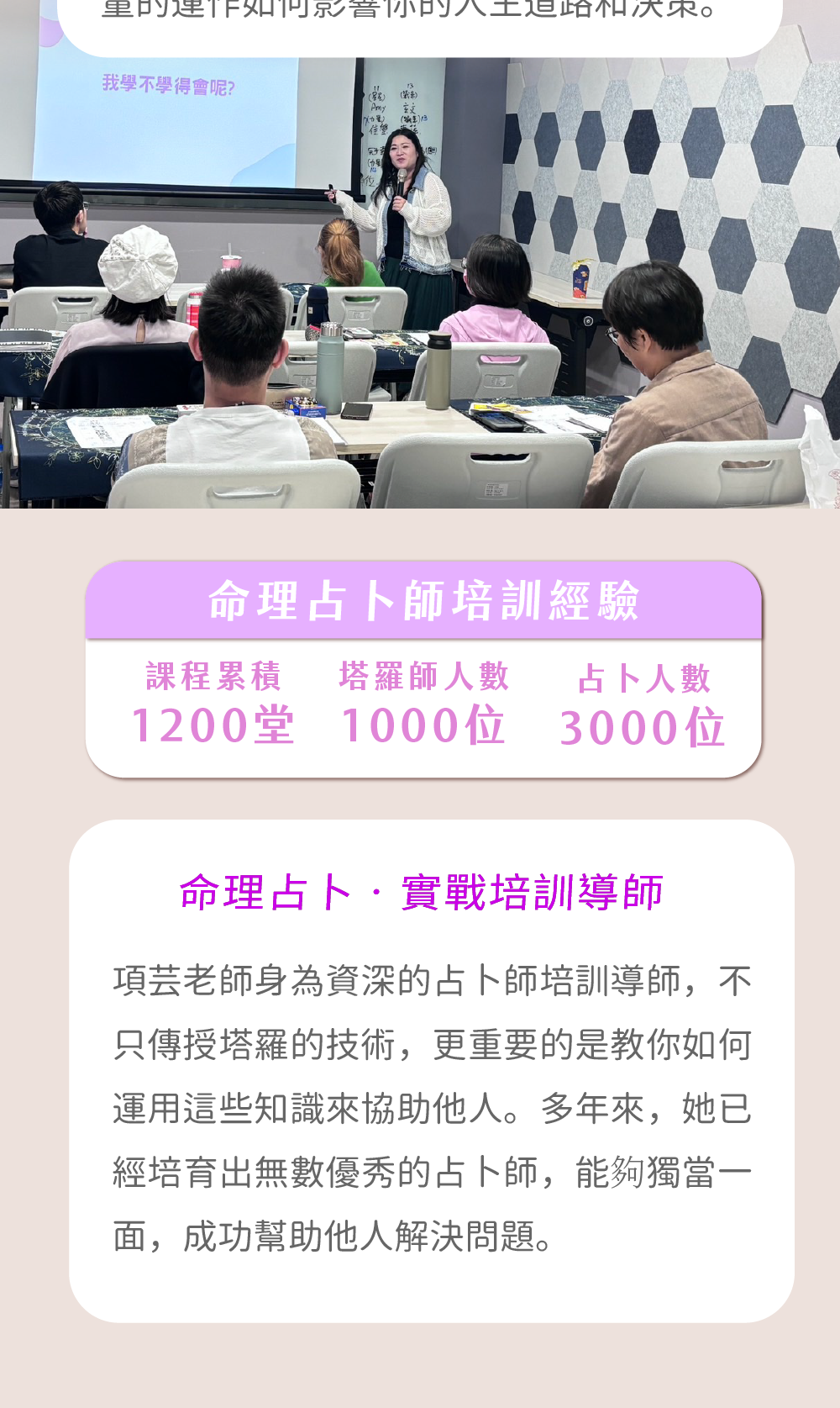 項芸老師最愛面對面的教學,從現場互動的回應,掌握學員們上課的吸收程度,也會隨著現場碰到個案的不同,解鎖不同的秘密!